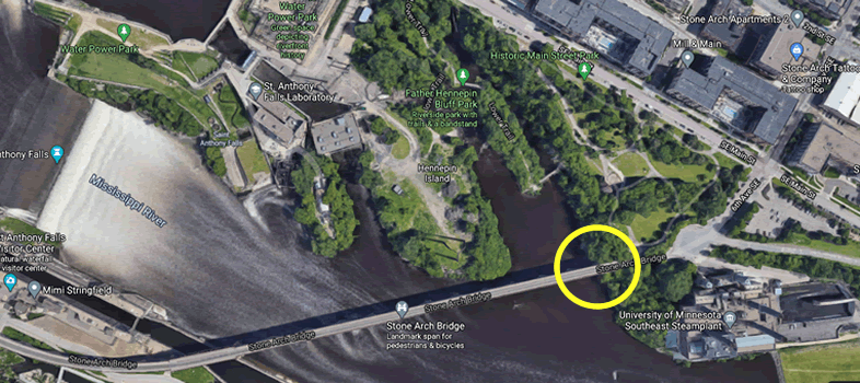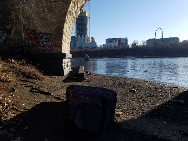 We'll start with the east end of the SAB. There is a park on the East side that is part of St. Anthony (the other side of the river is Minneapolis). This is the spot where I took the pictures of my boys with their carp that you saw on the previous page.