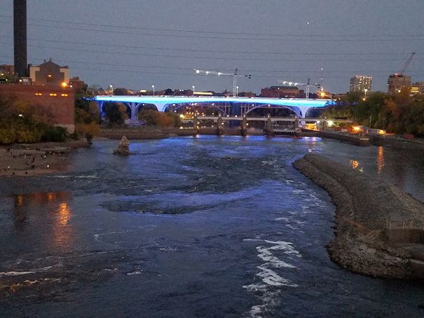 Or at night you can see the new I-35 bridge (it is the one lit up in blue light) that was built after the previous bridge collapsed in 2008. If