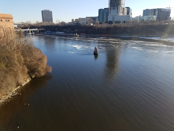 There used to be a an older iron truss bridge just south of the SAB. The old pier has been there forever. Unfortunately I don't have two shots of it from the top of the bridge from the same angle. Still you can see the erosion that has been occurring under the water line. The other problem with the picture from the drawdown is that it was taken as it was getting dark. You can still see it though.