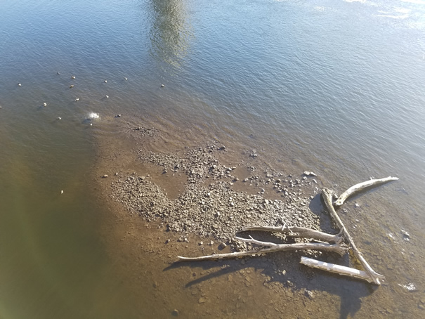 It may be hard to tell that these two pics are of the same place. The darkness and different angles make it hard to do a comparison. Just south of one of the piers of the SAB is a sandbar (ok, rockbar) that has been there forever. In the drawdown picture you can see the logs on the right side. The sandbar has had a few logs stranded on it and is a favorite resting spot for ducks and geese. It also isn't uncommon to see a bald eagle sitting on one of the branches of the logs waiting for a dead fish to float by.